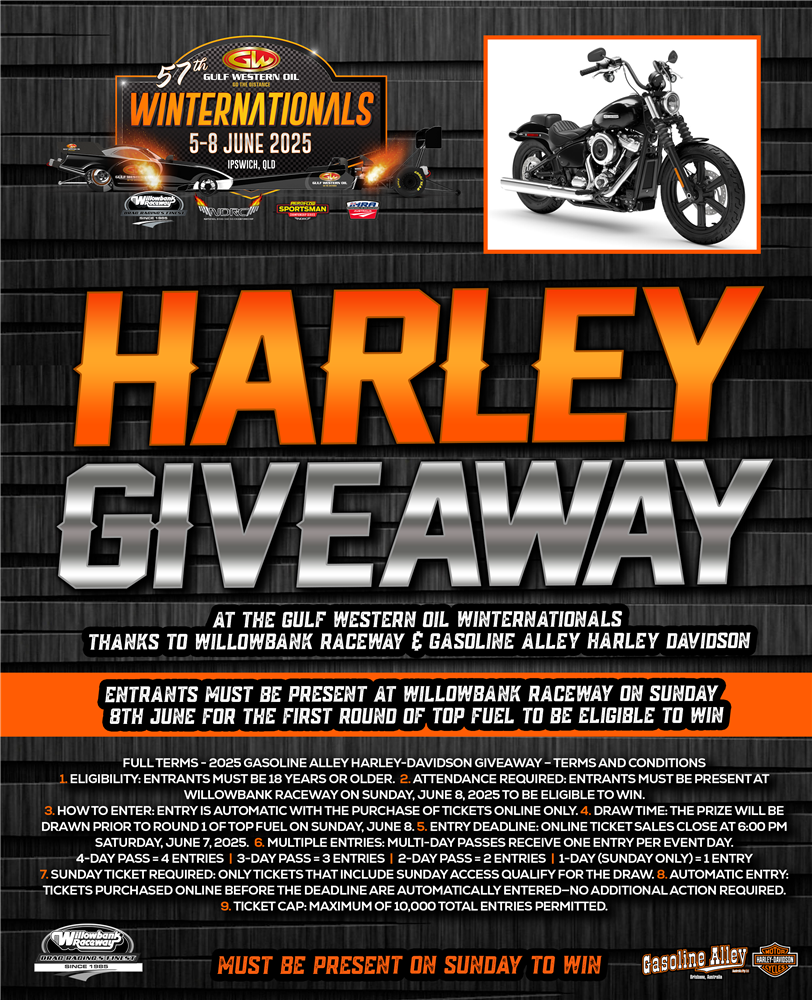 “This is about celebrating four decades of speed, community, and adrenaline,” said Andrew Casos, Operations Manager of Willowbank Raceway. “What better way to honour our legacy than with the chance to ride off on an iconic Harley?”